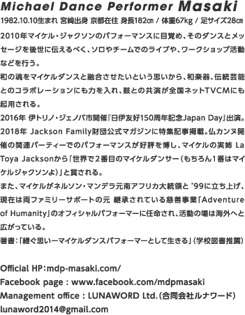 MICHAEL DANCE BACK PERFORMER JAZZ、HIPHOP、OLDSCHOOL等 2009年、2013年 佐々木美智子バレエ団[バフチサライの泉]出演 2012年 日テレ完コピ名曲No.1ダンス決定戦 準優勝チームメンバー その他イベント等出演多数](common/images/bio/crew/tx_profile_crew13.png)